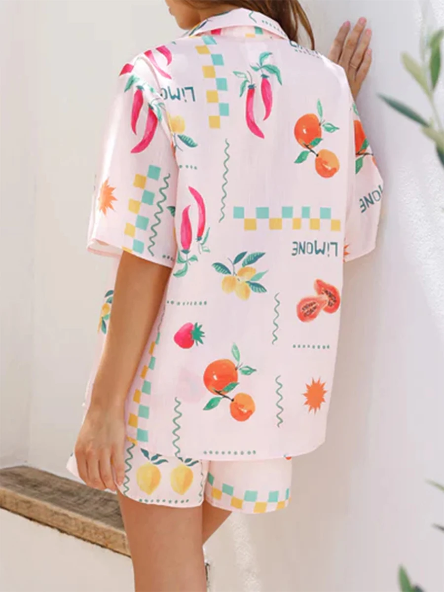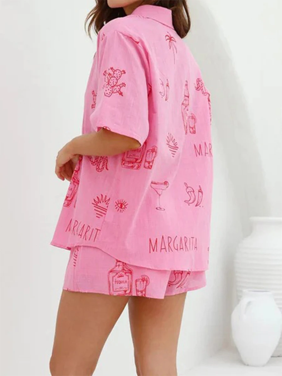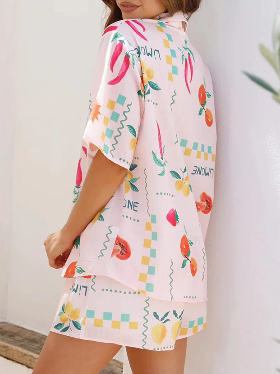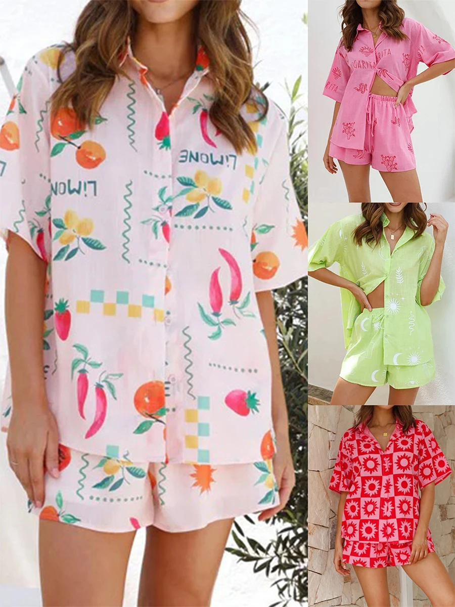 Embrace effortless summer style with this trendy Women's Graphic Print Shorts Set! Designed for both comfort and fashion, this 2-piece outfit features a short-sleeve button-up blouse and elastic-waist shorts, perfect for beach days, vacations, or casual outings.